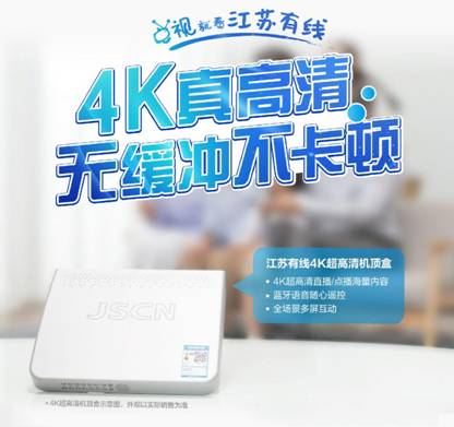 江蘇有線4K超高清機頂盒,兼具廣電真4K、高清電視直播、時移回看、互聯網視頻點播、人工智能語音控制、視頻通話、同屏推送等眾多功能。