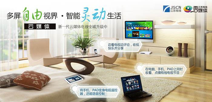 云媒體電視是江蘇有線根據國家三網融合試點要求,堅持技術、業務、服務三個創新,按照“鞏固傳統數字電視業務、全力拓展互聯網數據業務、重點開發視頻增值業務”的全業務發展思路自主研發的第三代數字電視系統。