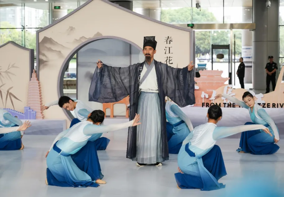 “大江東去,浪淘盡,千古風(fēng)流人物?!眴?dòng)儀式上,舞者們通過(guò)翩然的舞姿展現(xiàn)長(zhǎng)江之磅礴氣勢(shì)與鱗波。“江河奔騰,文脈恒長(zhǎng)”,隨著北宋文學(xué)家“蘇軾”形象的入場(chǎng),嘉賓們跟隨著“蘇軾”的視角,一步入境,一同步入這場(chǎng)數(shù)字漂流,在流動(dòng)的數(shù)字景觀中感知母親河的生命脈動(dòng),體悟“我與長(zhǎng)江”的時(shí)代共振。