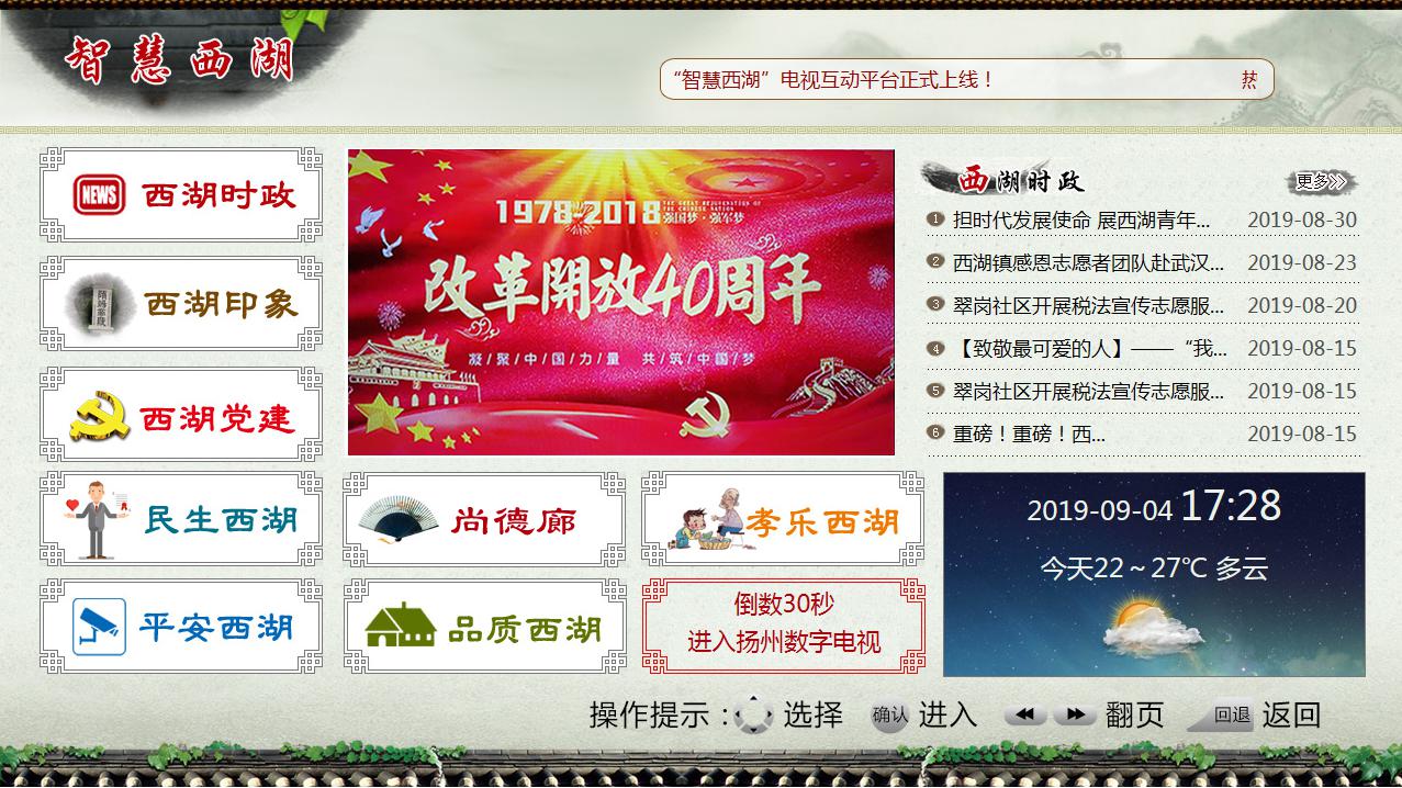 公司助力“智慧揚州”建設,著力發展“智慧鄉鎮”,目前已形成以“智慧楊壽”、“智慧西湖”、“智慧沙頭”為代表的“智慧鄉鎮”電視互動平臺體系。以“智慧西湖”電視互動平臺為例,平臺通過整合西湖鎮各類信息資源,以圖文信息與視頻節目相結合的方法,將鎮政府工作動態、政策法規、各類活動信息推送到西湖鎮居民家中,最終實現信息資源的共享。項目主要有三大特點:一是高效實現基層信息傳遞“最后一公里”,西湖鎮居民打開互動機頂盒即出現“智慧西湖”界面,與傳統媒體相比,開機推送模式使平臺信息推送到達率更高;二是有效推進西湖鎮“群防群治”工作開展,“平安西湖”監控平臺已在西湖鎮部分小區以及學校、廣場、公園等主要路段安裝實時監控,西湖鎮居民在家即可觀看實時監控畫面,還支持回放功能;三是有效推進全鎮現代公共文化服務體系建設,加快高清村建設。該平臺對于完善西湖鎮公共服務體系,打通宣傳服務“最后一公里”,增強鎮黨委、政府宣傳力和影響力,具有重要的意義。